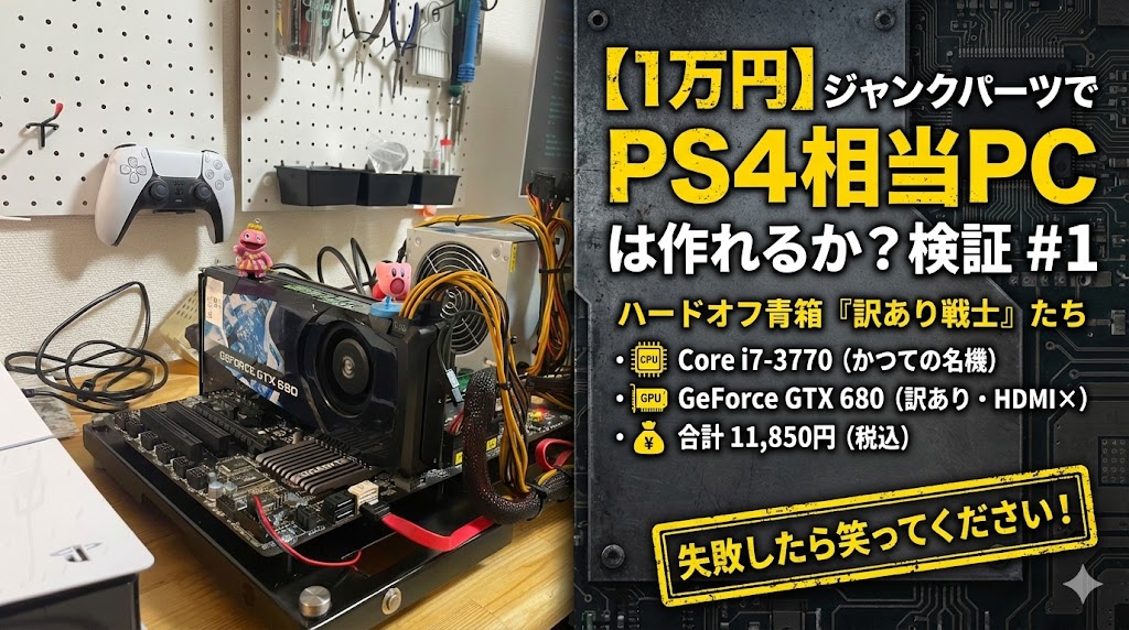 これは、プロの自作講座ではありません。 予算1万円ちょっと、ハードオフの青箱(ジャンク)から拾ってきた「訳ありパーツ」だけで、どこまで遊べるマシンが作れるかを試す実験ドキュメントです。